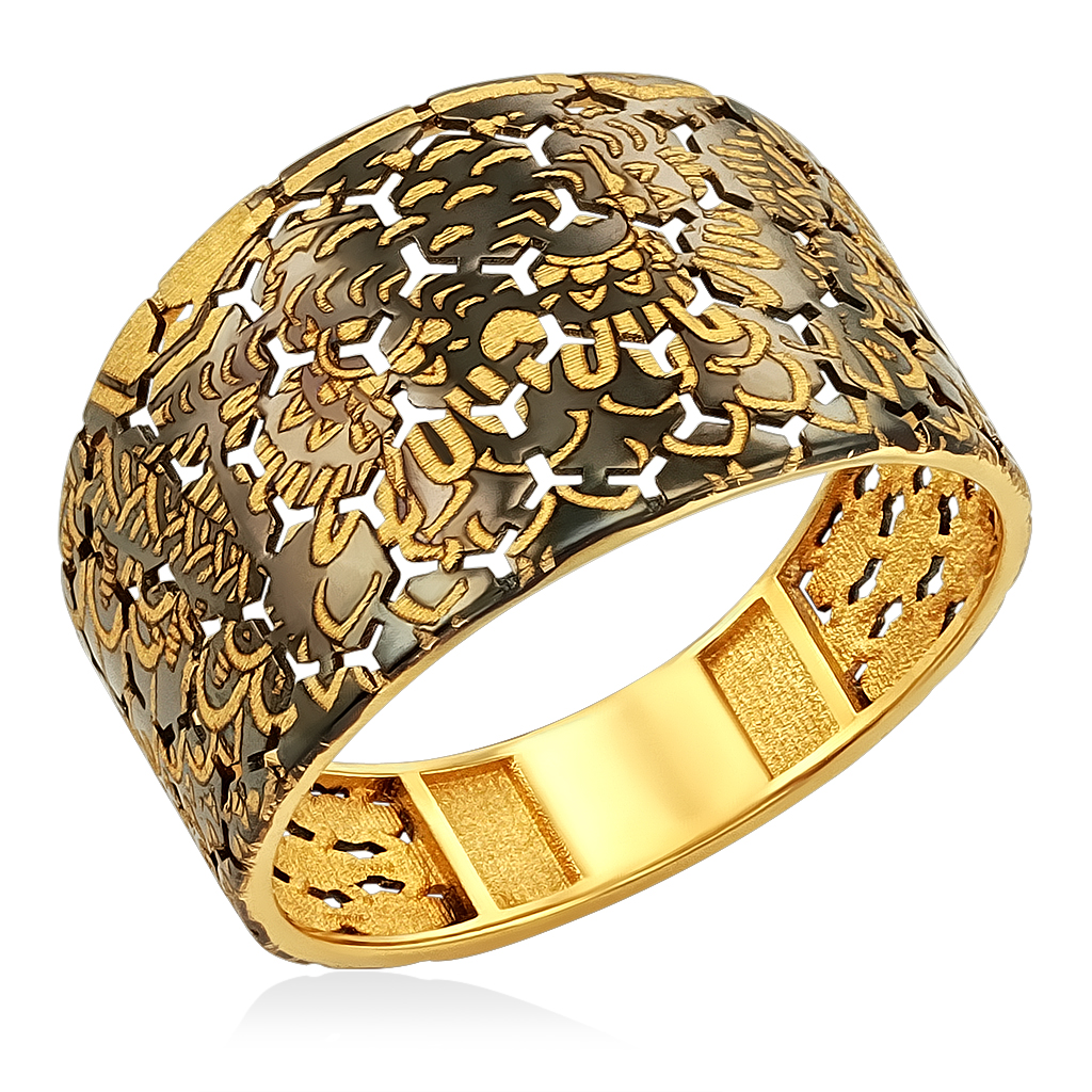 Кольцо ювелирное изготовлено из желтого золота 585 пробы. Матовая поверхность кольца и покрыта темным блестящим родием, создавая необычный перьевой орнамент. Кольцо широкое по лицевой стороне и с заужением по тыльной стороне.