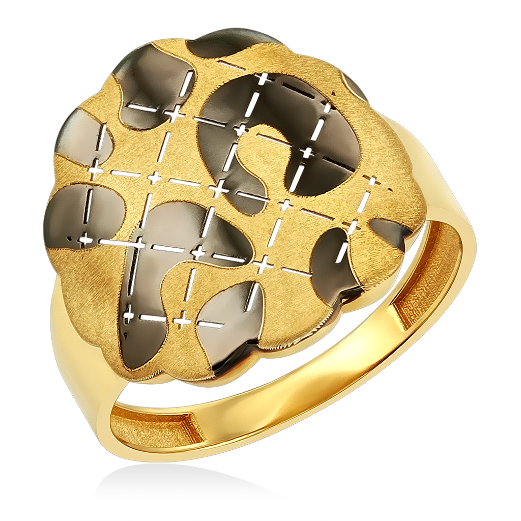 Кольцо ювелирное изготовлено из желтого золота 585 пробы. Матовая поверхность кольца и покрыта темным блестящим родием, создавая уникальный леопардовый орнамент. Кольцо широкое по лицевой стороне с заужением по тыльной стороне.