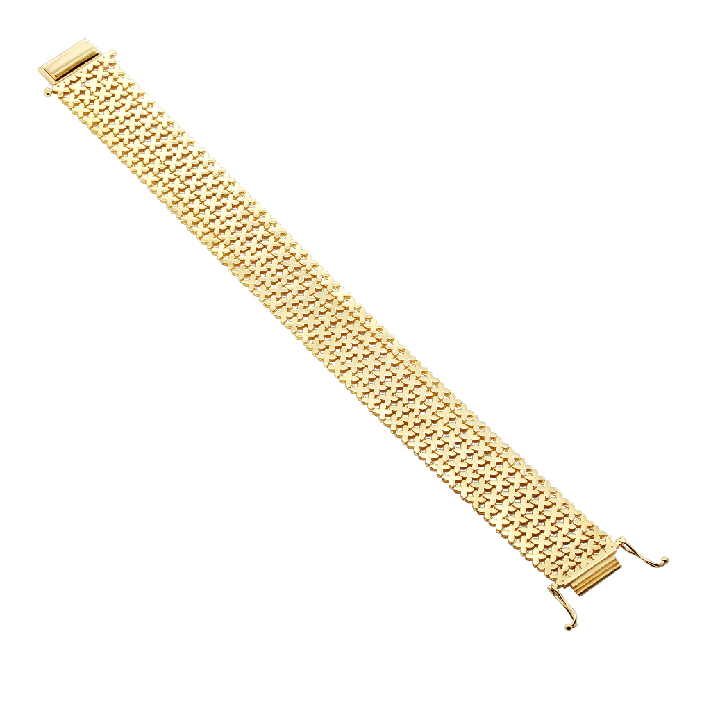 Браслет ювелирный мягкий изготовлен из желтого золота 585 пробы. Браслет состоит из плоских звеньев, которые закреплены между собой на петлях. Такая технология позволяет придать браслету мягкость и гибкость, словно он выполнен из кожи рептилии.