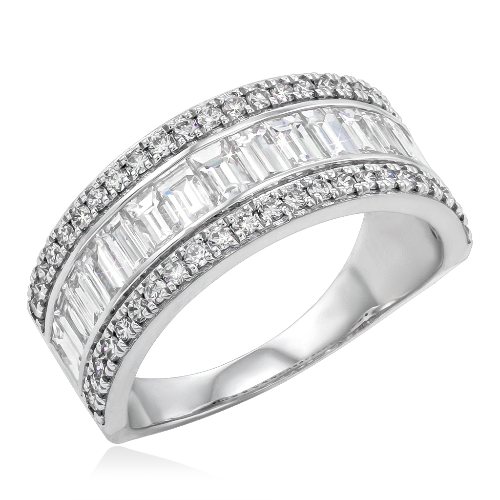 Его можно носить в паре с обручальным кольцом или как самостоятельное украшение. Кольцо сочетает в себе бриллианты круглой огранки, которые расположены по краям шинки, бриллианты огранки багет, закрепленне по центру поверхности.