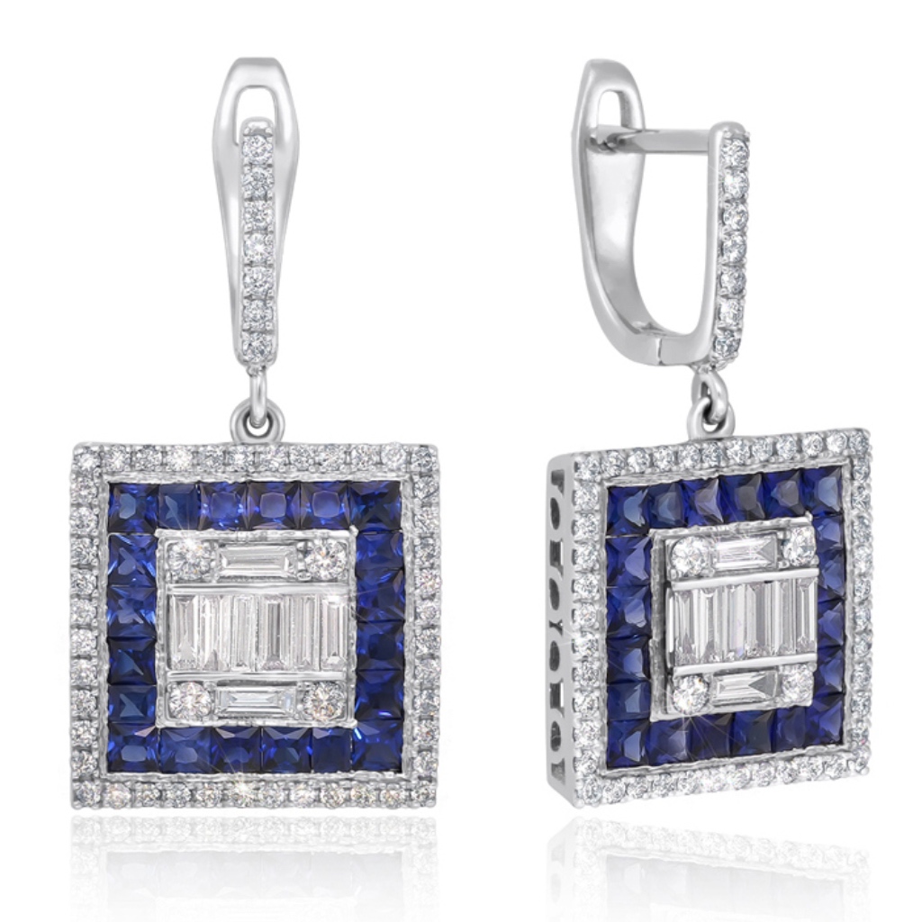 На каждой подвеске расположены багетные и круглые бриллианты в сочетании с насыщенно-синими сапфирами квадратной огранки. Контраст прозрачных бриллиантов и глубокого синего цвета сапфира создает выразительную композицию и подчеркивает премиальный характер украшения. Основание серег дополнительно украшено мелкими круглыми бриллиантами, усиливающими мерцающий эффект.