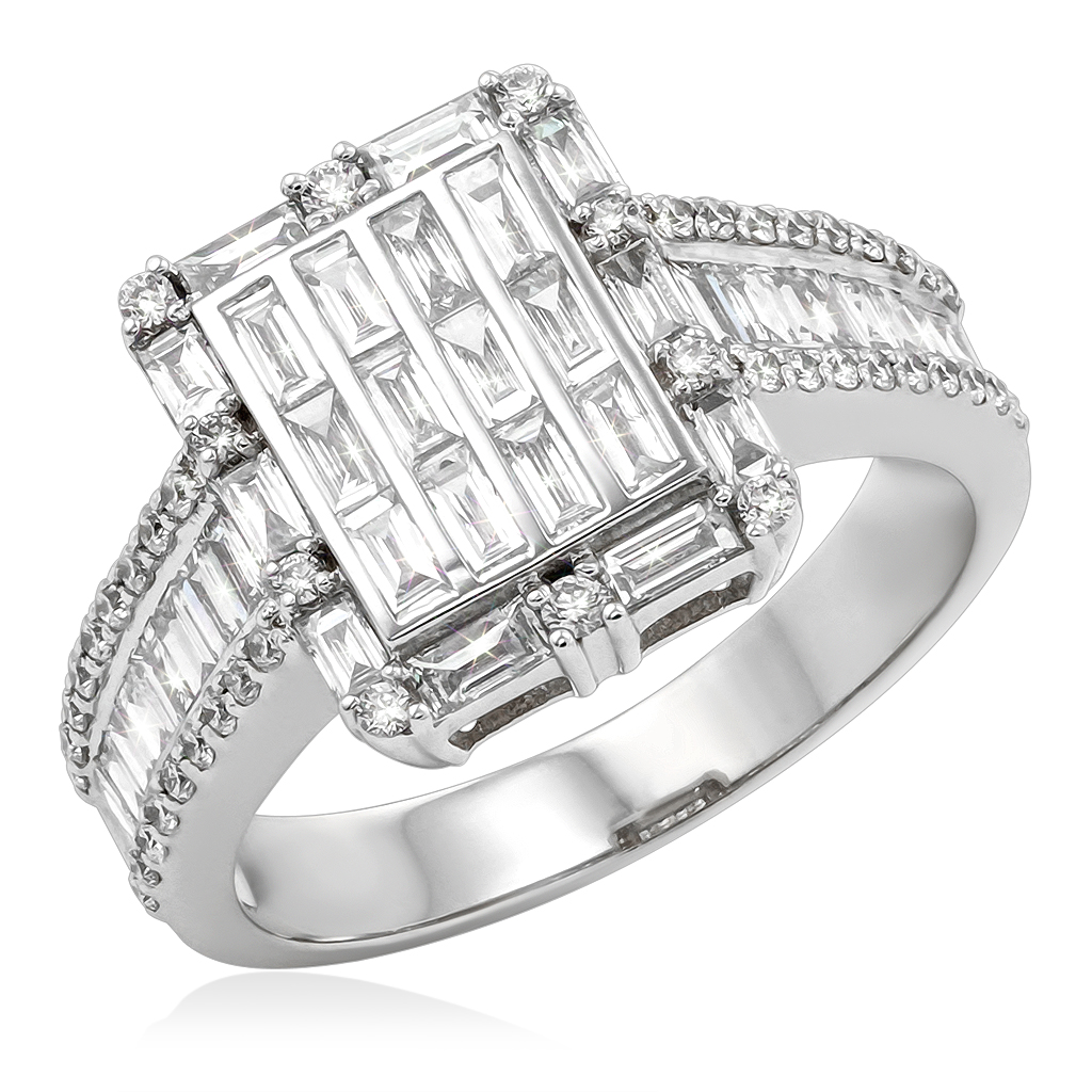 Кольцо с идеальными пропорциями с прямоугольным декоративным элементом щедро украшено бриллиантами багетной огранки.