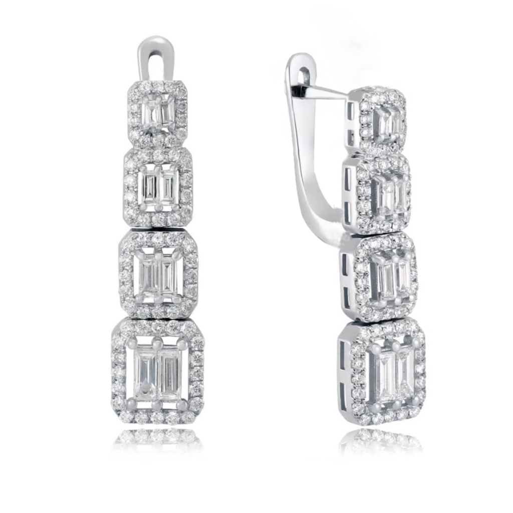 Серьги из белого золота 585 пробы с английским замком от Mostar Jewellery отлично подойдут для неформального образа, а также эффектно дополнят нарядный, вечерний, праздничный или свадебный образ. Сверкающие бриллианты багеты прекрасно сочетаются с круглыми бриллиантами или бриллиантами других огранок, и придают украшению дополнительный шарм и привлекательность.