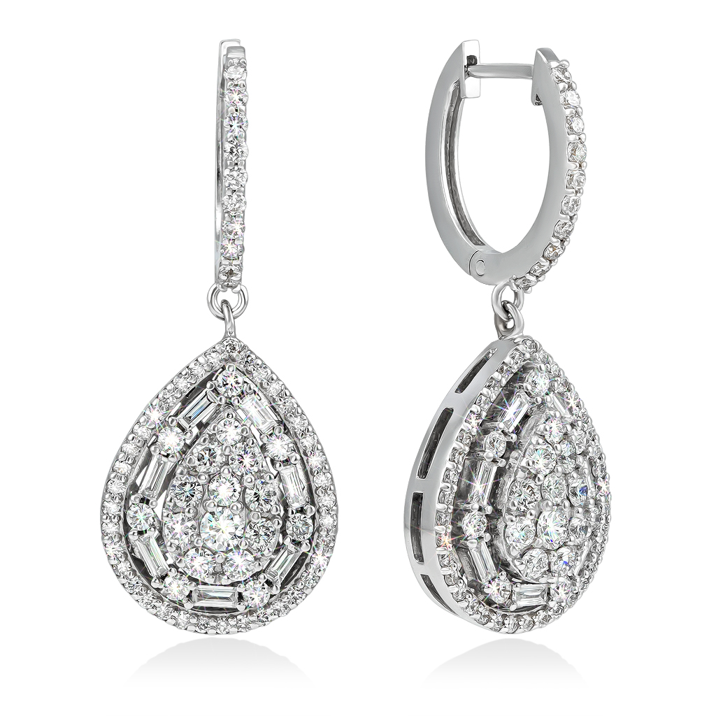 Серьги выполнено в виде капли, украшенной и россыпью круглых и багетных бриллиантов по окантовке.