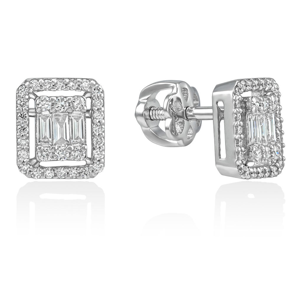 В центре каждой серьги расположены по 3 багетных бриллианта в окружении 6 бриллиантов круглой огранки.