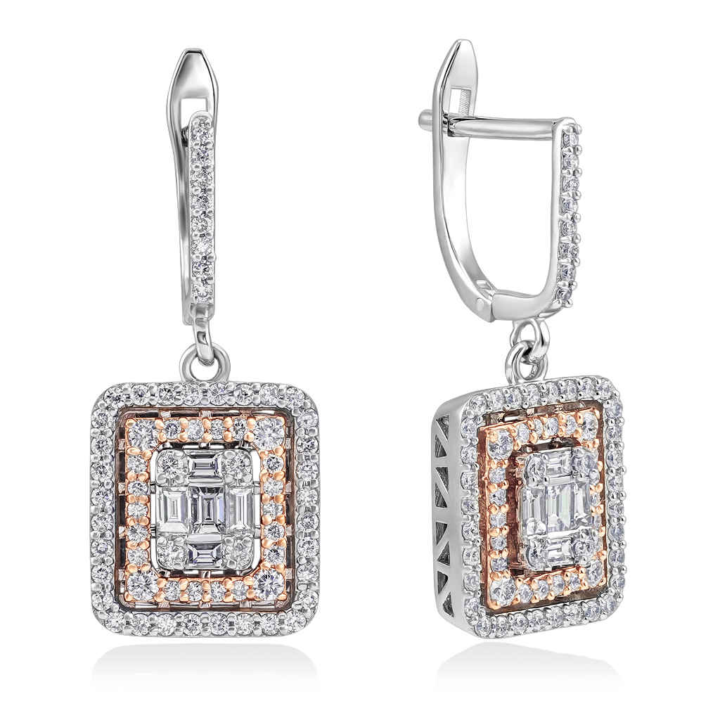 На тонком основании закреплена подвижная подвеска прямоугольной формы. Основание по всей длине украшено бриллиантами круглой огранки, создающими плотное сияние. В центре каждой подвески расположены багетные бриллианты и бриллианты круглой огранки, что усиливает игру света и придает украшению объемный блеск.