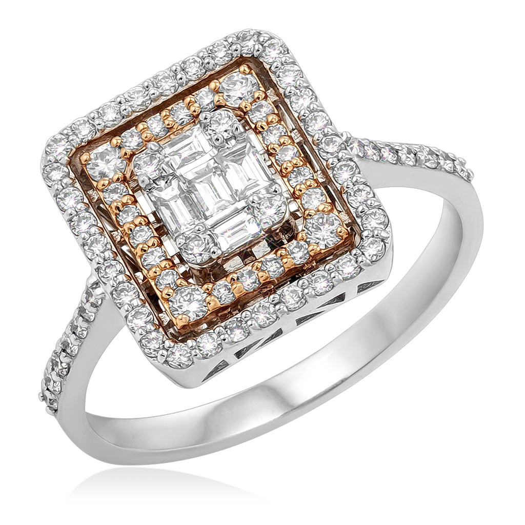 В центре прямоугольной верхушки расположены багетные бриллианты, дополненные по периметру бриллиантами круглой огранки. Такое сочетание огранок создает объемный блеск и усиливает игру света. Частично верхушка покрыта розовым родием, что придает украшению контраст цвета и подчеркивает глубину композиции.