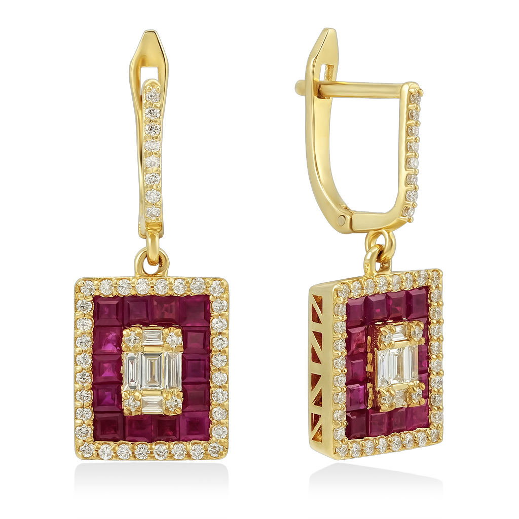 Золотые серьги на английском замке с прямоугольной подвеской - отличное украшение для себя и в подарок. На каждой подвеске серьги расположены багетные и круглые бриллианты в сочетании с насыщенно-алыми рубинами огранки квадрат. Основание украшено мелкими круглыми бриллиантами. Легкое покачивание подвижной подвески создает непрерывный мерцающий эффект этого украшения и всегда будет привлекать внимание окружающих.