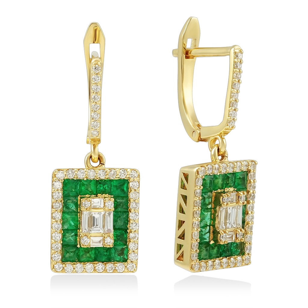 Золотые серьги на английском замке с прямоугольной подвеской - отличное украшение для себя и в подарок. На каждой подвеске серьги расположены багетные и круглые бриллианты в сочетании с насыщенно-зелеными изумрудами огранки квадрат. Основание украшено мелкими круглыми бриллиантами. Легкое покачивание подвижной подвески создает непрерывный мерцающий эффект этого украшения и всегда будет привлекать внимание окружающих.