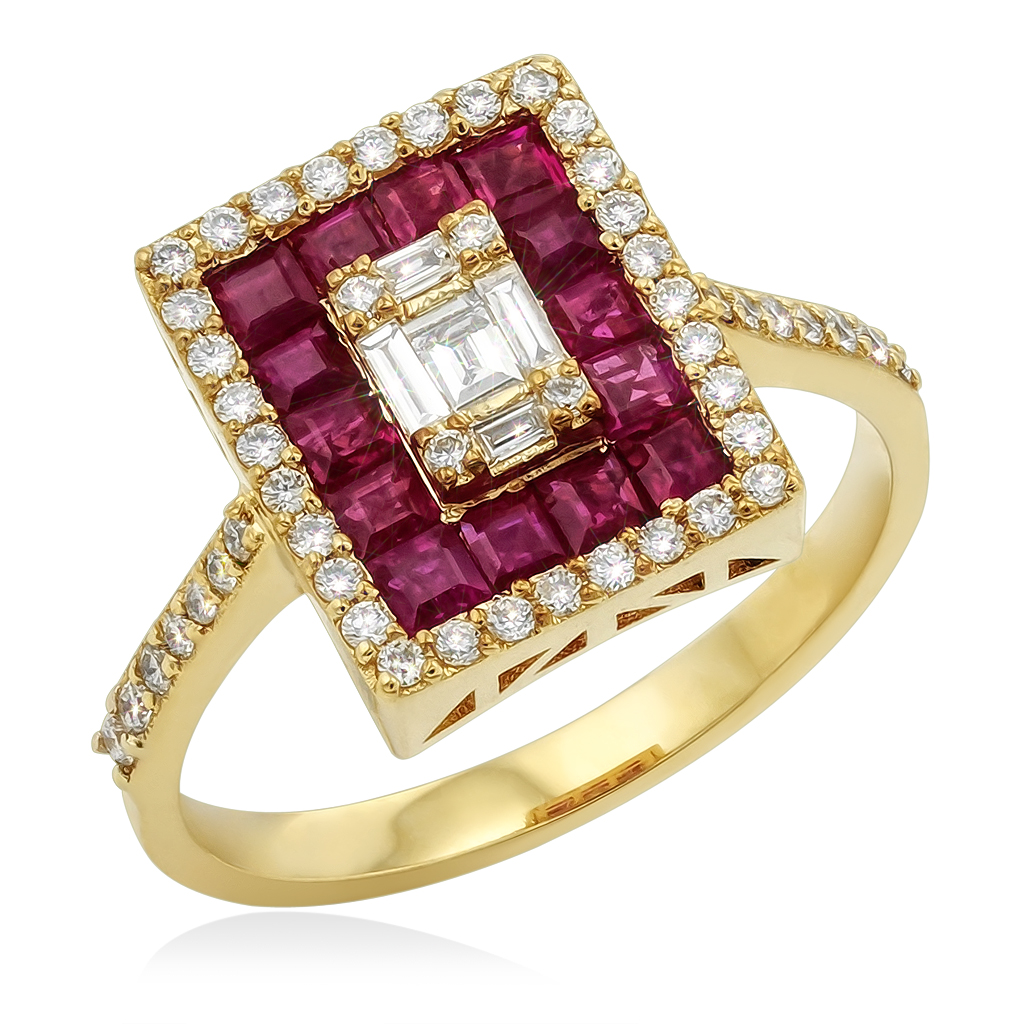 Геометрическое кольцо из белого золота с бриллиантами и рубинами украсит Ваш праздничный образ и привлечет внимание окружающих. Кольцо прямоугольной формы украшено бриллиантами разного размера круглой и багетной огранок и насыщенными ярко-алыми рубинами огранки квадрат. Такое сочетание камней придает украшению свою неповторимую форму, контраст цвета и особенный блеск.