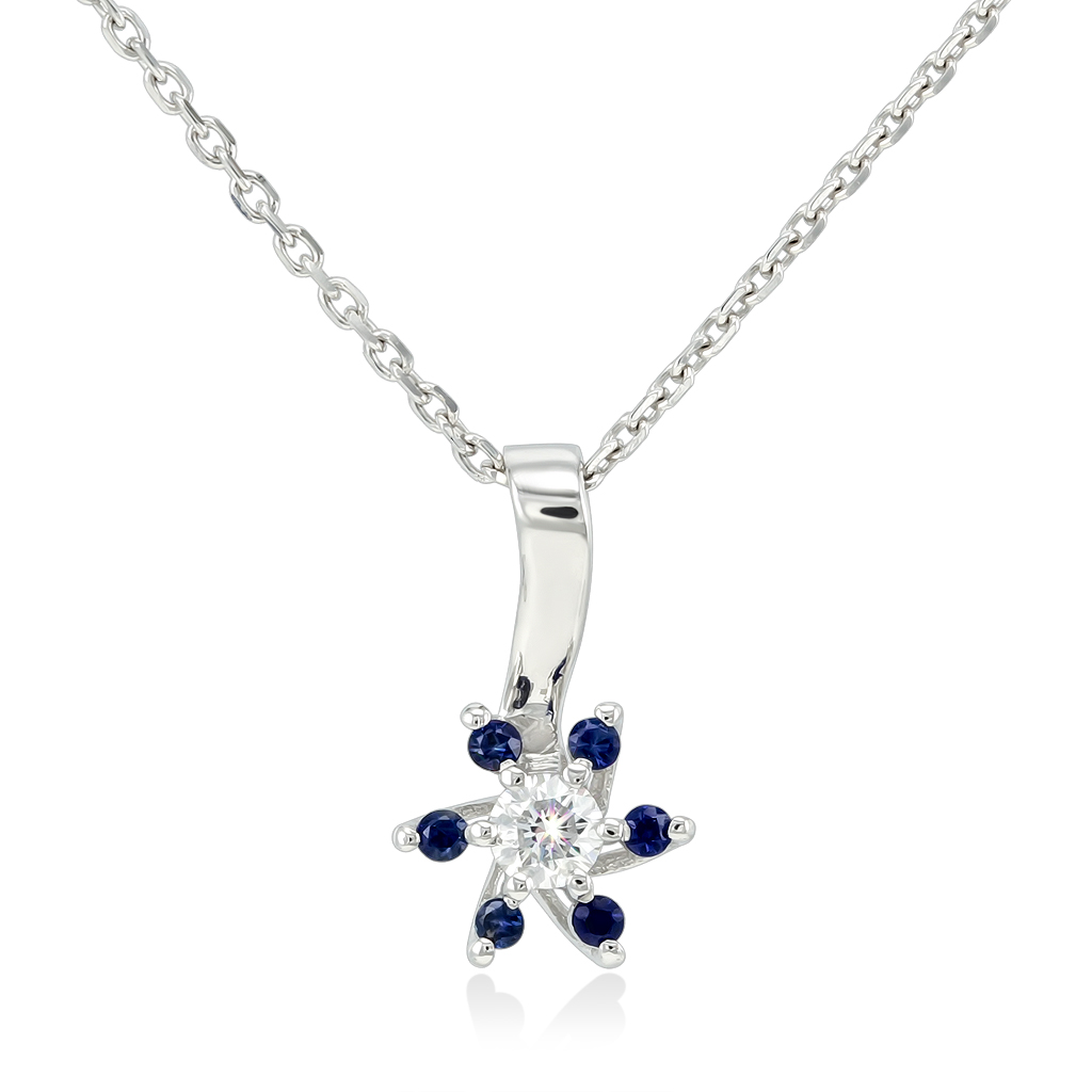 Золотое колье на цепочке с подвеской в виде цветка, эта модель - классика ювелирных украшений. В центре подвески расположен 1 бриллиант круглой огранки, по краям лепестков закреплены ярко-синие сапфиры. Украшение миниатюрное, размер цветка составляет 6 мм. К этому колье можно подобрать кольцо и серьги такой же модели. Отличное украшение для себя и в подарок.