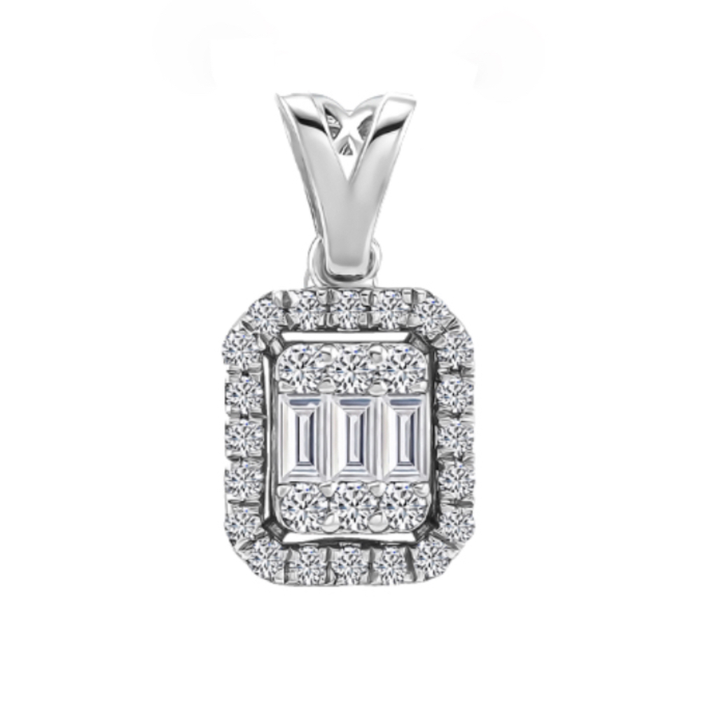Золотая подвеска с бриллиантами - всегда будет актуальна для любого случая. Миниатюрная подвеска из белого золота 585 пробы с прямоугольной формы украшена 3-мя багетными бриллиантами и 6-ю бриллиантами круглой огранки. По периметру их дополняют маленькие круглые бриллианты, визуально увеличивая размеры подвески. Сочетание камней разной формы создает непрерывный мерцающий блеск, что всегда будет привлекать внимание окружающих.