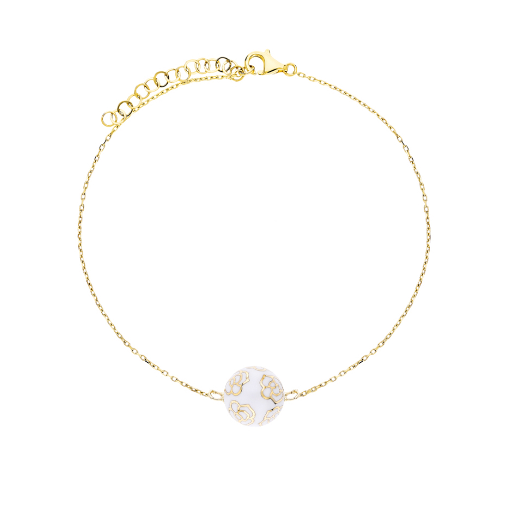 Золотой браслет женский 585 пробы с эмалью и декоративными цветочками — стильное и оригинальное украшение для себя или в подарок. Фантазийный браслет выполнен из легкого желтого золота, украшен шариками с белой эмалью и миниатюрными золотыми цветочками. Все элементы обработаны алмазной огранкой, что придаёт изделиям яркое сверкание и эффектный блеск.