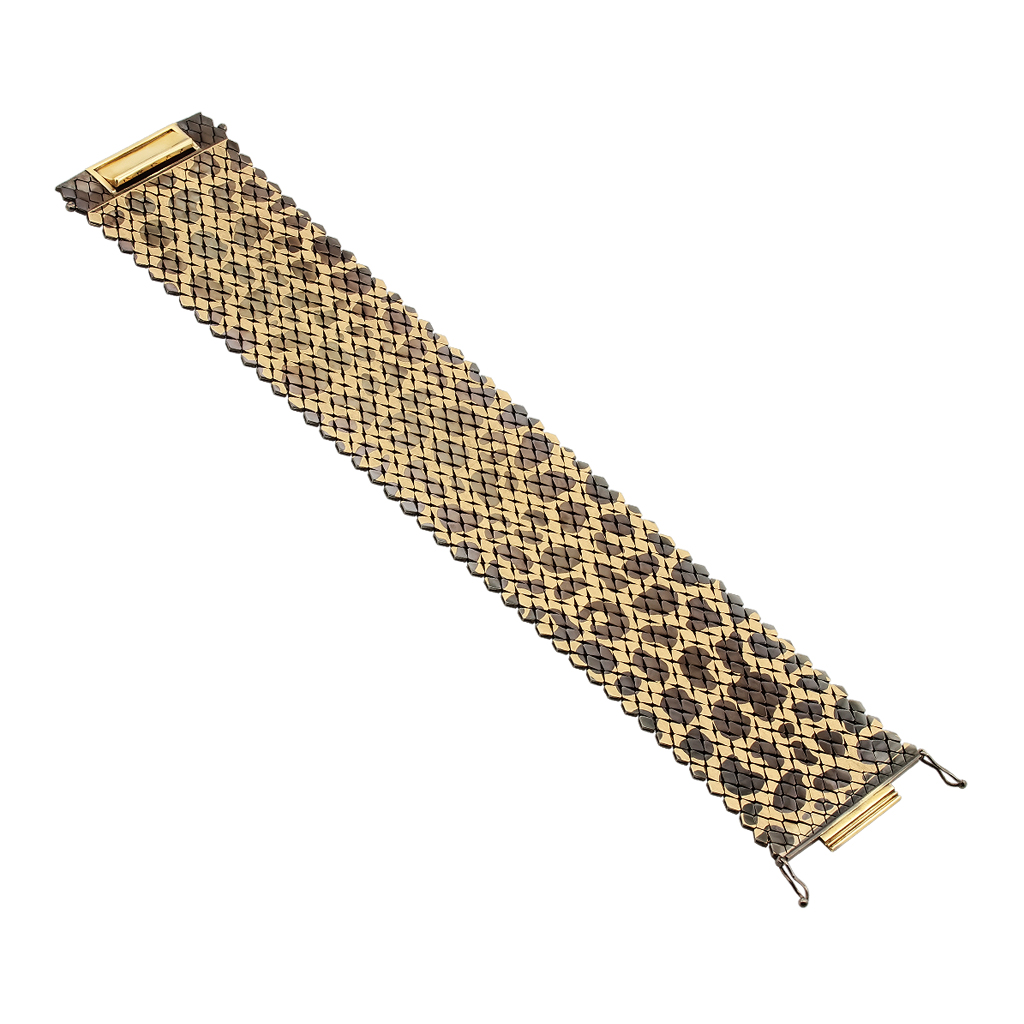 Звенья браслета матовые и покрыты бежевым и темно-коничневым родием под цвет змеи. Красивый и стильный женский браслет станет элегантным дополнением Вашего классического, делового или нефоримального стиля, украсит Ваш вечерний образ. Он будет нежно обхватывать запястье, словно шелковая манжета. Ширина браслета 39 мм, толщина 1,2 мм.