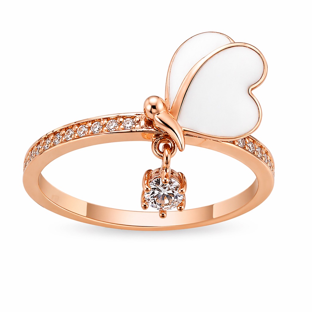 Кольцо выполнено из серебра 925 пробы и покрыто розовой позолотой. В основании кольца красуется белая бабочка, крылья которой покрыты белой эмалью.