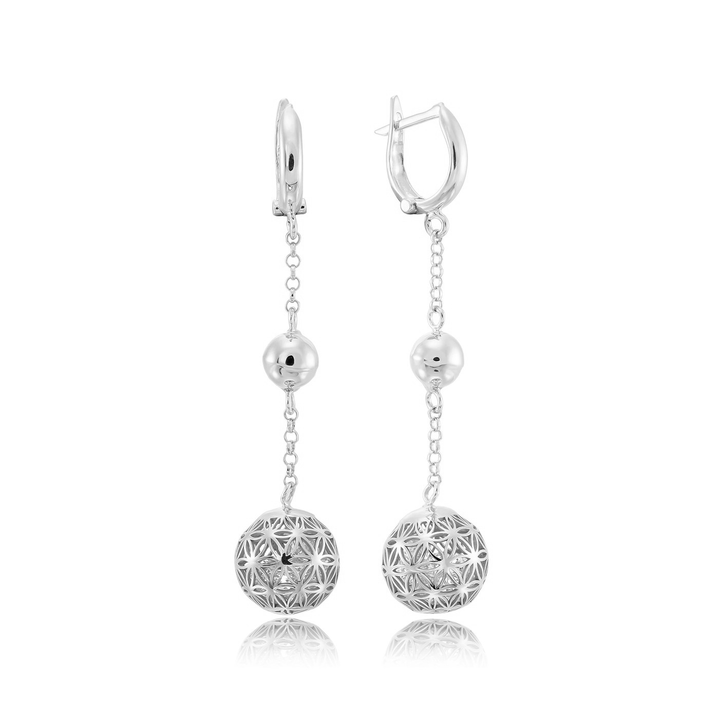 Внутри ажурного шарика находятся фианиты, они подсвечивают шарик изнутри и придают ему нежный мерцающий блеск. Эта модель давно завоевала популярность и хорошо сочетается с любым образом.