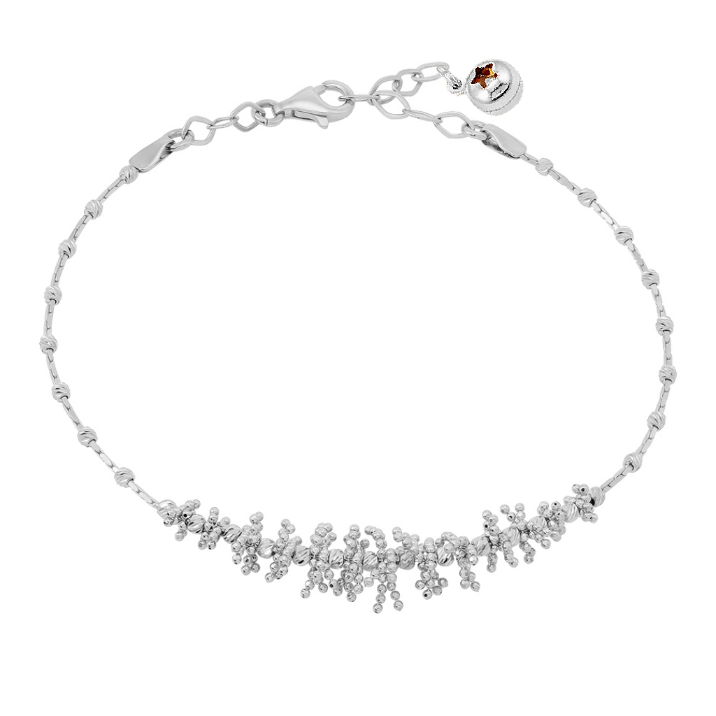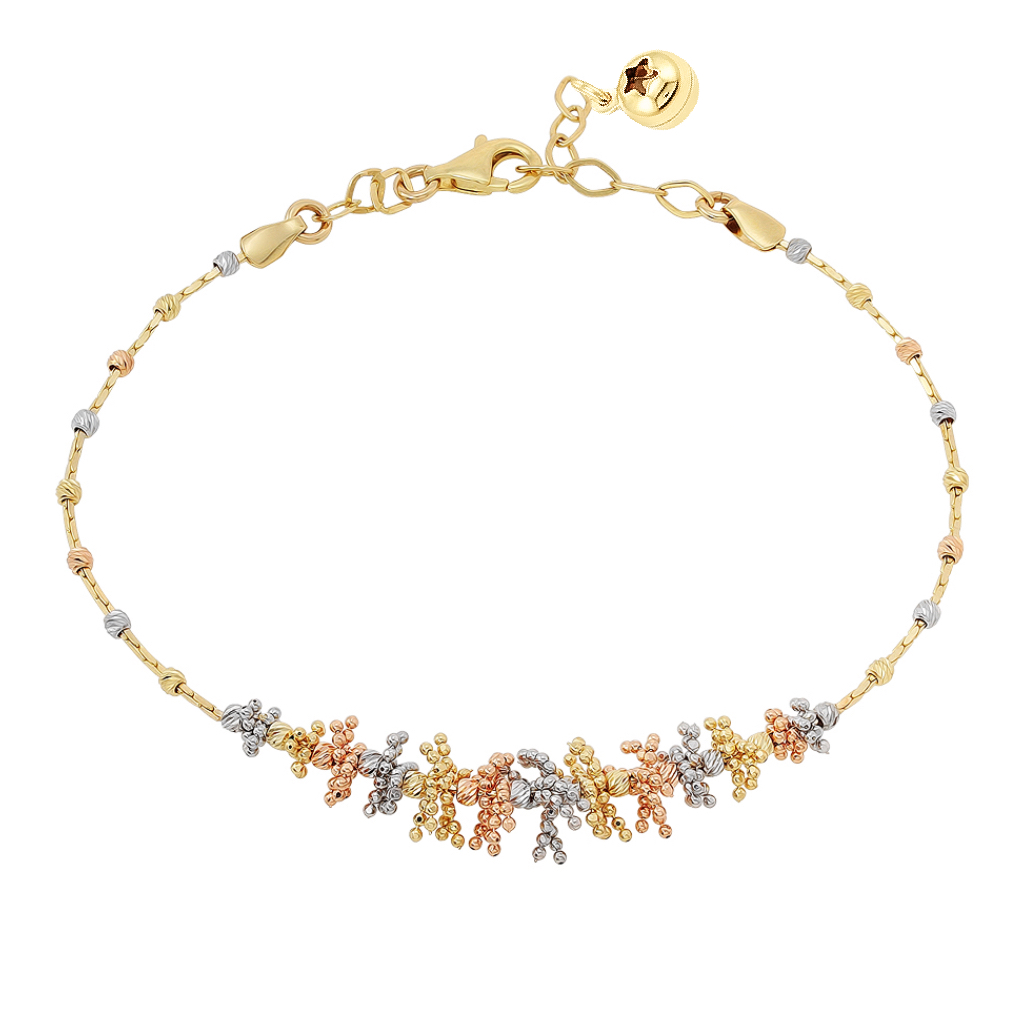 Браслет из комбинированного золота 585 пробы, произведённого в Италии – элегантное украшение для себя и в подарок. Фантазийное плетение выполнено из шариков разного размера, переплетенных по образу гирлянды, с алмазной огранкой, создающей переливчатый блеск. Дополнительные звенья позволяют изменять длину браслета на 2 см, обеспечивая идеальную посадку на запястье.