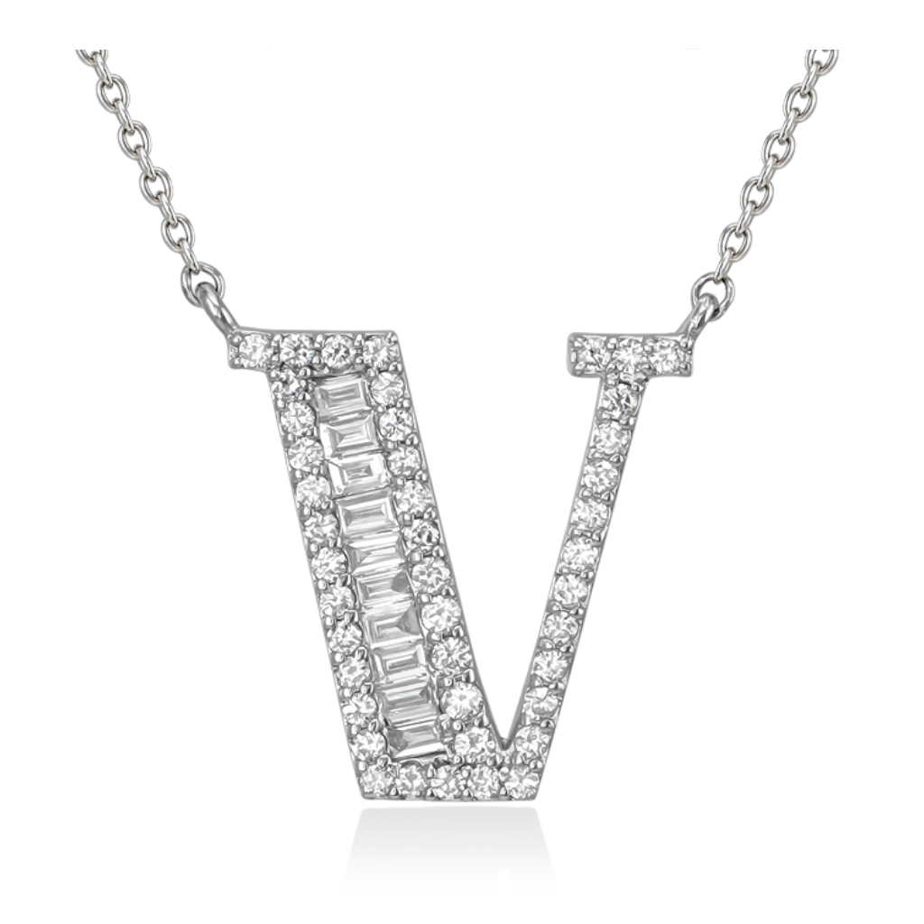 Латинская заглавная буква V украшена 10 бриллиантами багетной огранки и 43 бриллиантами круглой огранки.