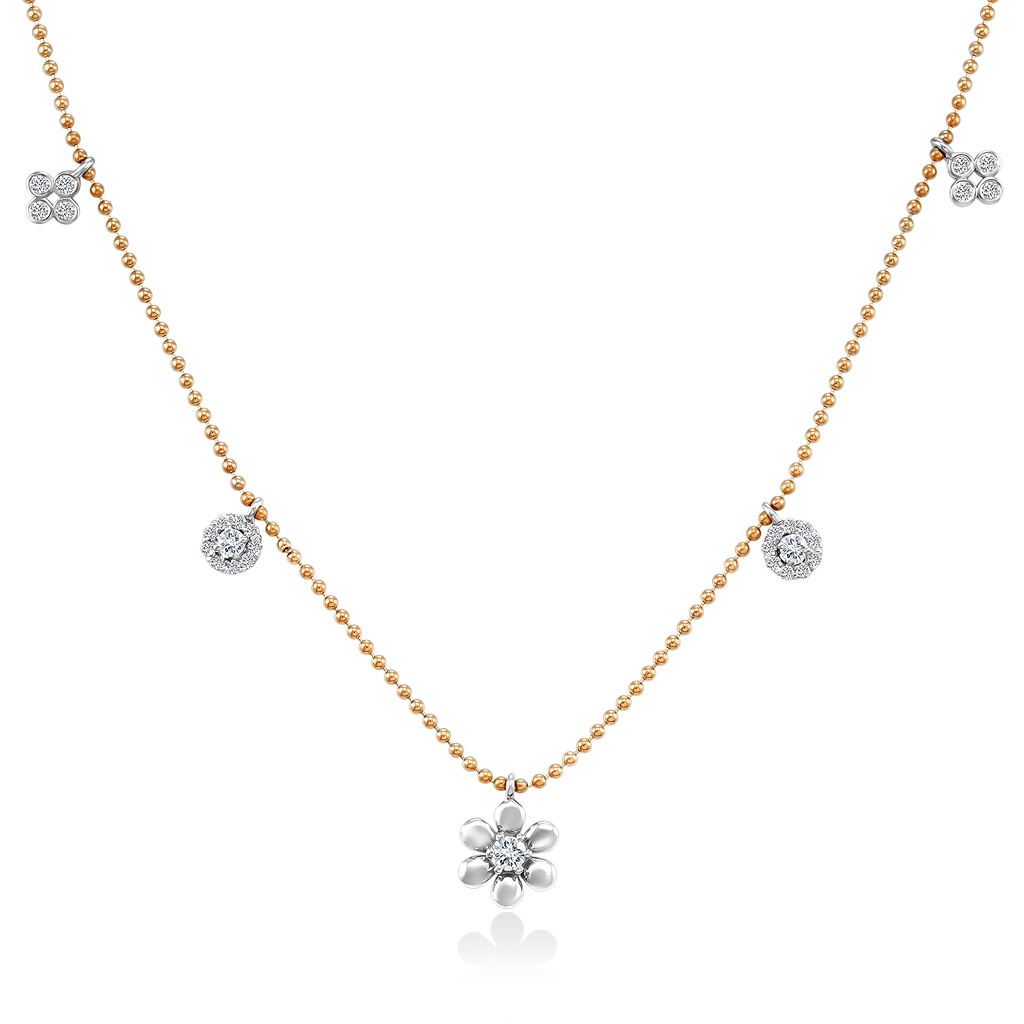 Колье из золота 585 пробы с бриллиантами - отличное украшение для себя и в подарок. Современная фантазийная модель очень красиво смотрится на шее и подходит для любого случая. Колье состоит из цепочки из мелких шариков с алмазной огранкой и миниатюрных подвесок разных форм, закрепленных по всей длине. Подвески украшены бриллиантами круглой огранки, сверкая при ярком освещении.