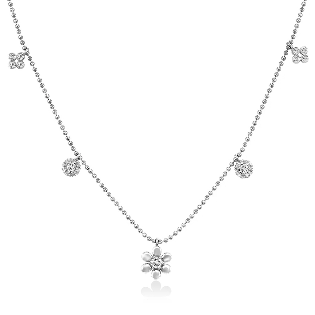Колье из золота 585 пробы с бриллиантами - отличное украшение для себя и в подарок. Современная фантазийная модель очень красиво смотрится на шее и подходит для любого случая. Колье состоит из цепочки из мелких шариков с алмазной огранкой и миниатюрных подвесок разных форм, закрепленных по всей длине. Подвески украшены бриллиантами круглой огранки, сверкая при ярком освещении.