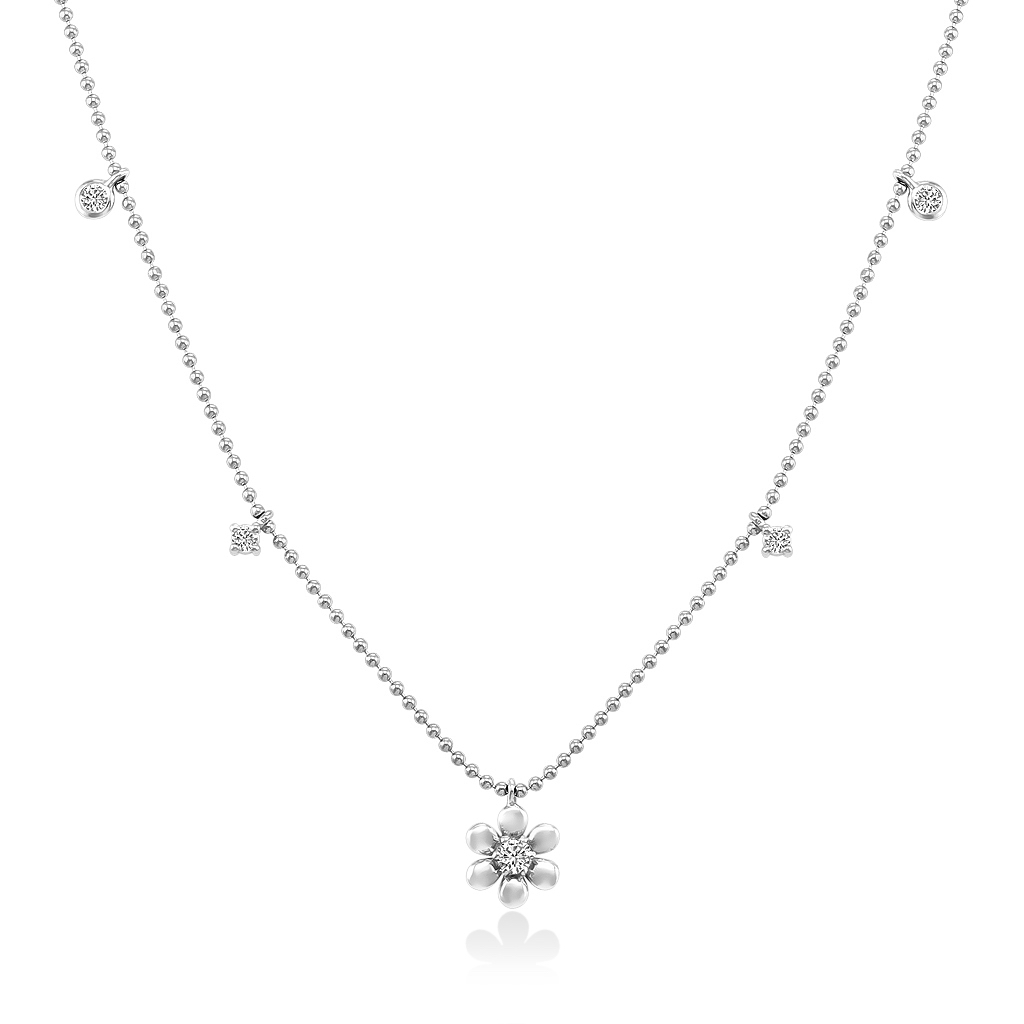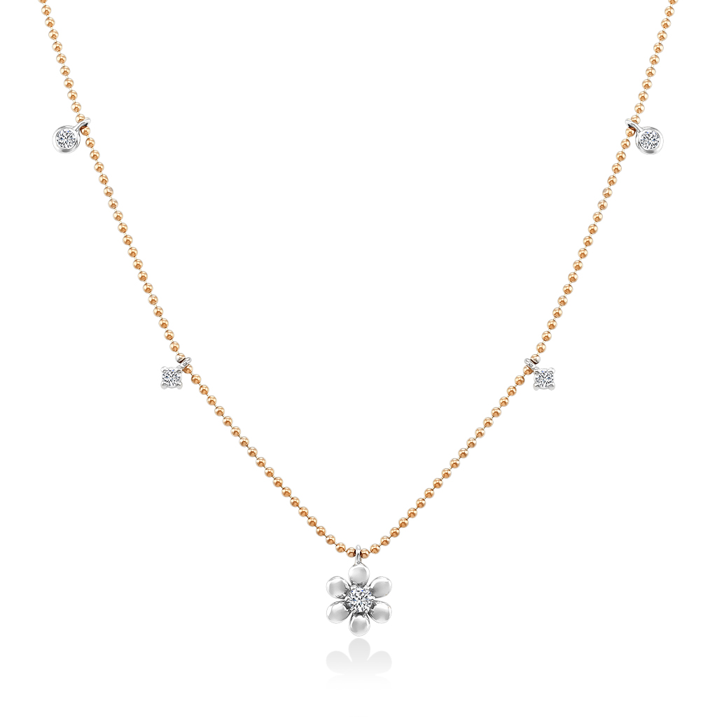 Колье состоит из цепочки из мелких шариков с алмазной огранкой и миниатюрных подвесок разных форм, закрепленных по всей длине. Подвески украшены бриллиантами круглой огранки, сверкая при ярком освещении.