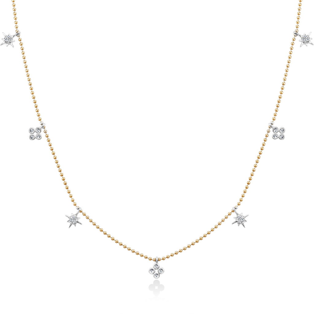 Колье из золота 585 пробы - отличное украшение для себя и в подарок.Современная фантазийная модель очень красиво смотрится на шее и подходит для любого случая. Колье состоит из цепочки из мелких шариков с алмазной огранкой и миниатюрных подвесок разных форм, закрепленных по всей длине. Подвески украшены бриллиантами круглой огранки, сверкая при ярком освещении. Стильное модное ювелирное колье отлично подойдет для повседневной носки, а также эффектно дополнит нарядный, вечерний, праздничный образ. В комплекте с нашими украшениями поставляется фирменная подарочная упаковка, благодаря чему их можно дарить своим любимым - маме, дочери, сестре, подруге, подарок на новый год, подарок на 8 марта, подарок на день рождения. Чтобы украшение радовало Вас своей красотой бесконечно долго, рекомендуем избегать попадания на него агрессивных химических и парфюмированных средств.Все наши золотые украшения проходят клеймение в Российской Государственной Инспекции пробирного надзора, что подтверждает и гарантирует качество производителя. Все украшения из золота имеют пробу. Проба нанесена лазерным методом гравировки. У каждого украшения есть бирка, основной паспорт изделия, на которой указана вся подробная информация о металле и камнях, также указан УИН, с помощью которого можно проверить украшения на сайте пробирной палаты. Значение веса в характеристиках является примерным и может отличаться от фактического .