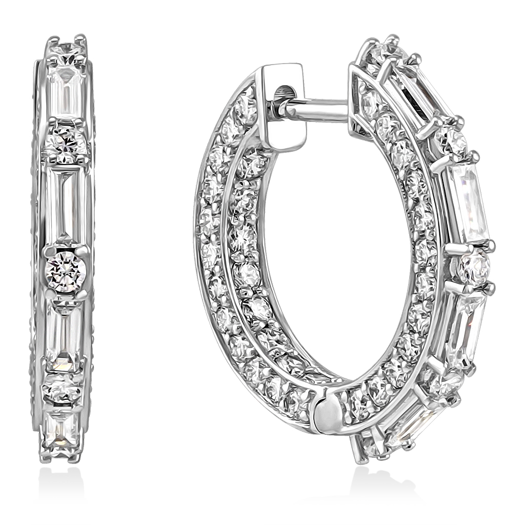 Золотые серьги 585 пробы с бриллиантами выполнены в форме колец. Такая модель давно стала популярной и актуальной в любое время. Эти серьги сочетают в себе 122 бриллианта круглой огранки, которые расположены по всей поверхности, и 8 бриллиантов огранки багет, закрепленных на лицевой поверхности. Серьги круглой формы, диаметр 21 мм, ширина 2,5 мм, толщина лицевой стороны 3 мм, тыльной 2 мм. Длина штифта 10 мм.