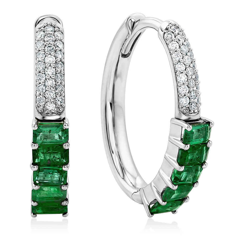 Эти серьги сочетают в себе мелкие бриллианты круглой огранки и 10 ярко-зеленых изумрудов прямоугольной огранки. Цветовой контраст камней делает серьги яркими и заметным, они будут дополнять любой образ.