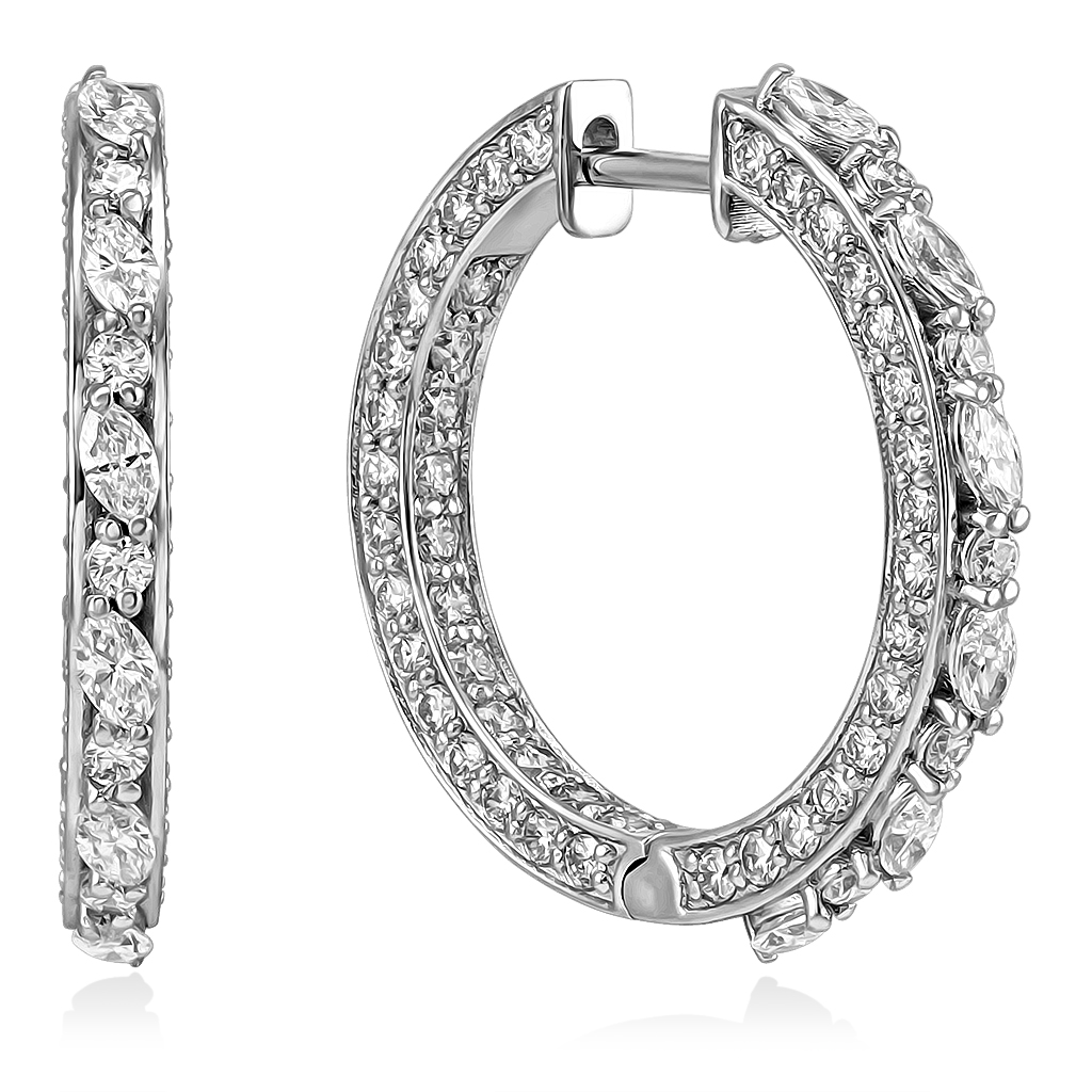 Золотые серьги 585 пробы с бриллиантами выполнены в форме колец. Такая модель давно стала популярной и актуальной в любое время. Эти серьги сочетают в себе 160 бриллиантов круглой огранки, которые расположены по всей поверхности, и 12 бриллиантов огранки маркиз, закрепленных на лицевой поверхности. Серьги круглой формы, диаметр 25 мм, ширина 2,5 мм, толщина лицевой стороны 3 мм, тыльной 2 мм. Длина штифта 10 мм.