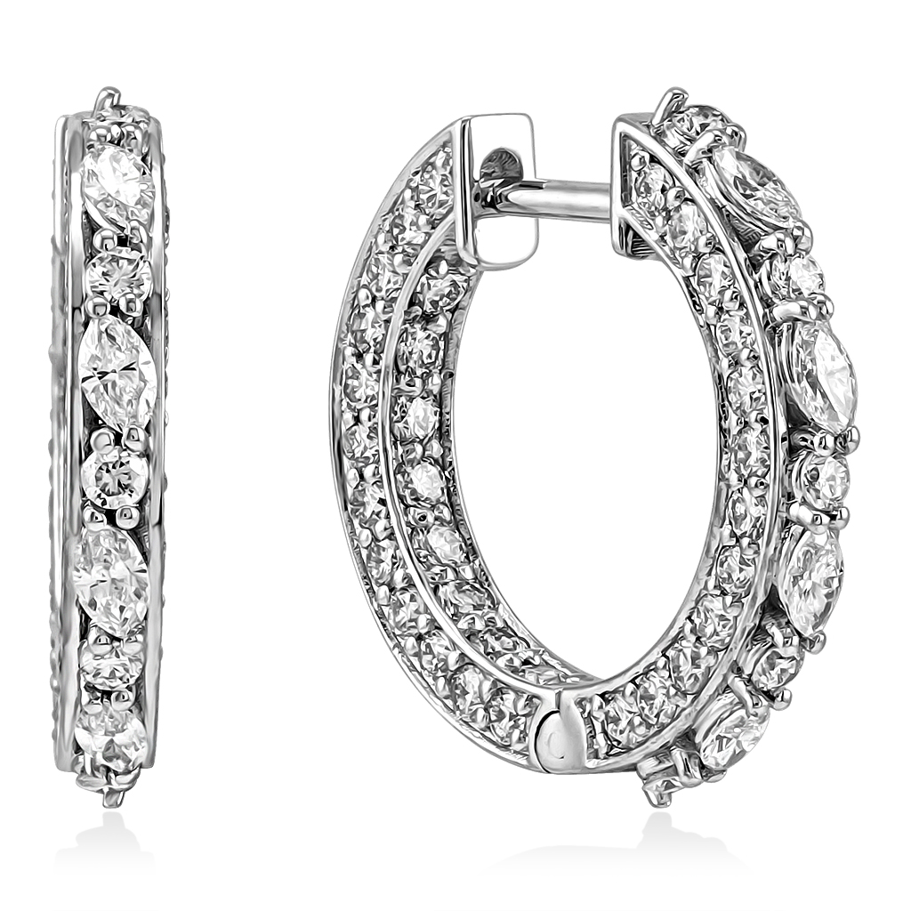 Золотые серьги 585 пробы с бриллиантами выполнены в форме колец. Такая модель давно стала популярной и актуальной в любое время. Эти серьги сочетают в себе 122 бриллианта круглой огранки, которые расположены по всей поверхности, и 8 бриллиантов огранки маркиз, закрепленных на лицевой поверхности. Серьги круглой формы, диаметр 21 мм, ширина 2,5 мм, толщина лицевой стороны 3 мм, тыльной 2 мм. Длина штифта 10 мм.