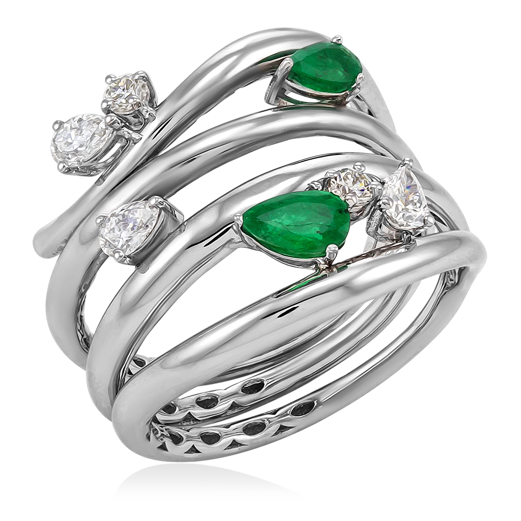 Широкое несимметричное кольцо с бриллиантами и изумрудами прекрасно сочетается с любым образом. Кольцо представляет из себя разветвлённую гладкую шинку, украшенную бриллиантами разных огранок и насыщенно-зелеными изумрудами огранки груша. Необычная форма и контраст цвета привлекает внимание и подойдет для поклонниц нестандартных крупных украшений. Максимальная ширина кольца 17 мм.