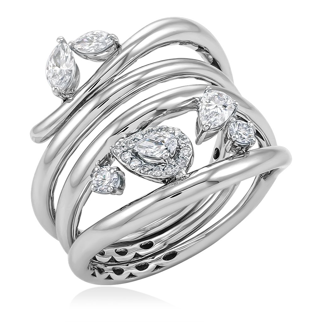 Широкое несимметричное кольцо с бриллиантами выделяется на фоне других украшений. Кольцо представляет из себя разветвлённую гладкую шинку, украшенную бриллиантами разных фантазийных огранок. Необычная форма привлекает внимание и подойдет для поклонниц нестандартных крупных украшений. Максимальная ширина кольца 19 мм.