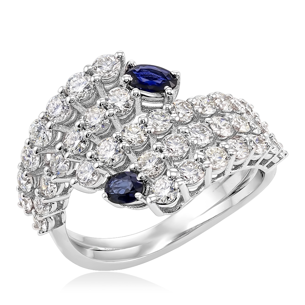 Незамкнутое асимметричное кольцо с бриллиантами прекрасно сочетается с любым образом. Кольцо представляет из себя двойную и тройную дорожку, украшенную россыпью круглых бриллиантов. Дорожки расположены внахлест и дополнены двумя овальными сапфирами. Это придает кольцу модный шарм и цветовой контраст. Каждая дорожка имеет ширину 2 мм, а общая ширина кольца 16 мм.