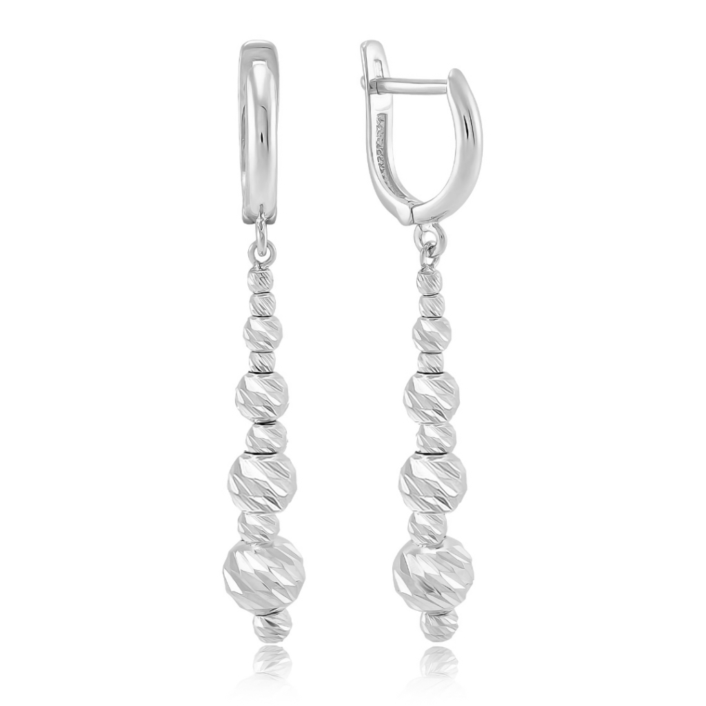 Серьги с подвесным элементом из белого золота 585 пробы производства Италии от Mostar Jewellery – изысканное и нарядное украшение, которое станет идеальным дополнением вашего повседневного и праздничного образа. Основание серег выполнено в классическом гладком дизайне, а подвесной элемент состоит из сочетания маленьких и больших золотых шариков, обработанных алмазной огранкой. Такая огранка придает украшению объем, переливчатый блеск и подчеркивает утонченность дизайна.