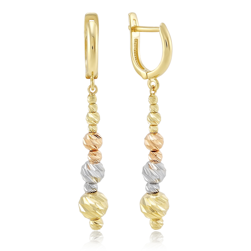 Серьги оснащены английским замком, который надежно фиксируется на защелке, обеспечивая удобную посадку на ухе. Длина штифта составляет 1 см, длина подвески – 3 см, диаметр шариков варьируется от 1 до 5 мм, что делает серьги эффектными, но легкими.