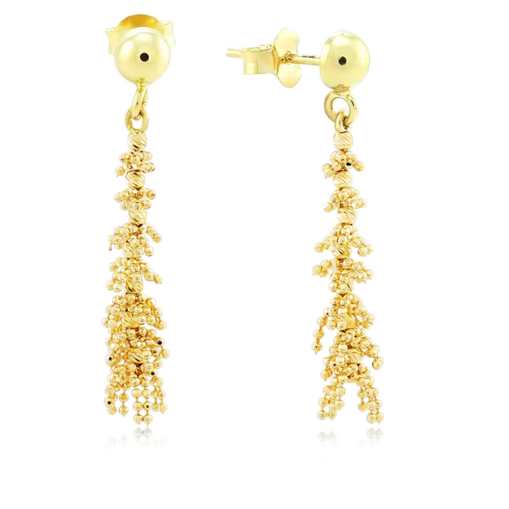 Украшение состоит из маленьких и больших золотых шариков, что создает объемную фактуру и придает дополнительный блеск.