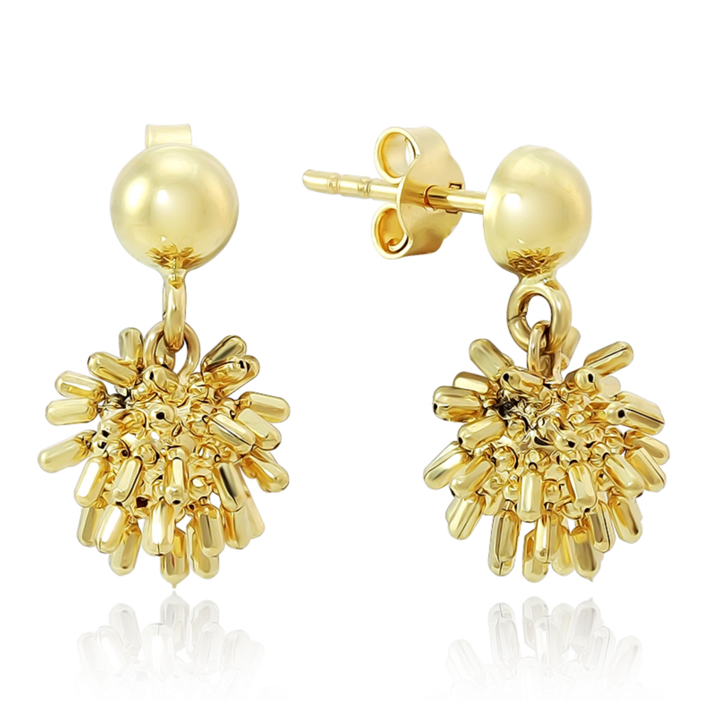 Необычные серьги пусеты с подвесным элементом выполнены из желтого золота 585 пробы.
