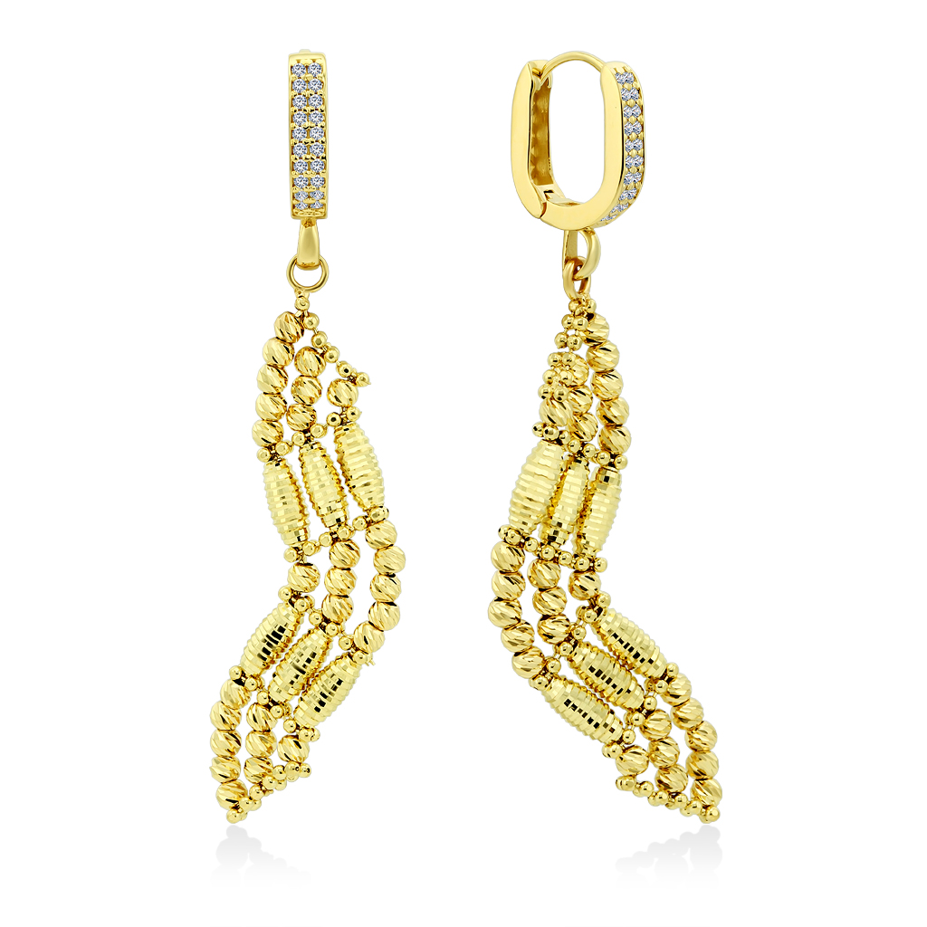 На некрупном основании с застежкой конго волнообразный подвесной элемент, состоящий из маленьких золотых шариков и трубочек, обработанных алмазной огранкой.