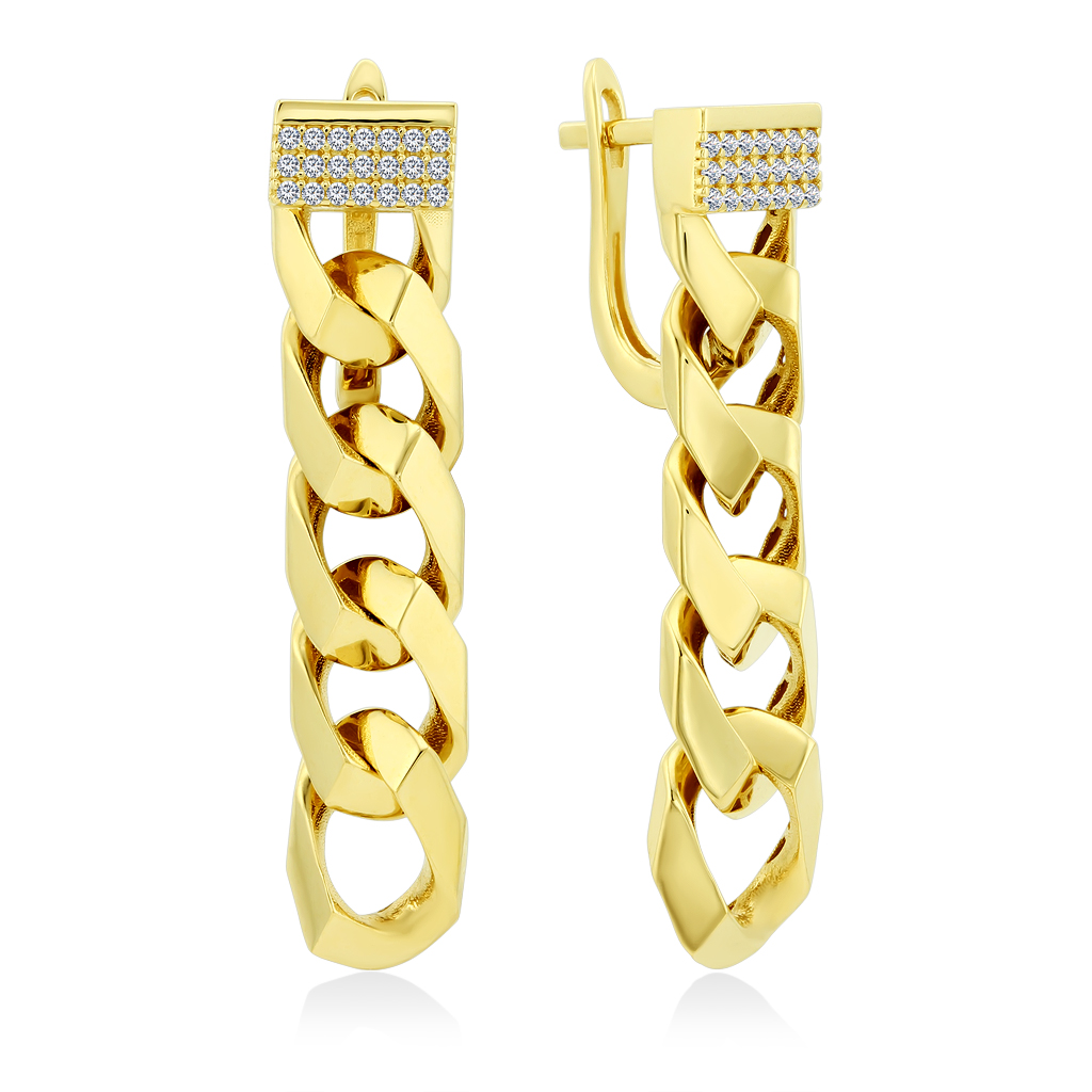Специальная станочная обработка создала геометрически скошенные грани в форме пирамиды на поверхности цепочки, они зеркально отражают свет и серьги смотрятся идеально благородно.