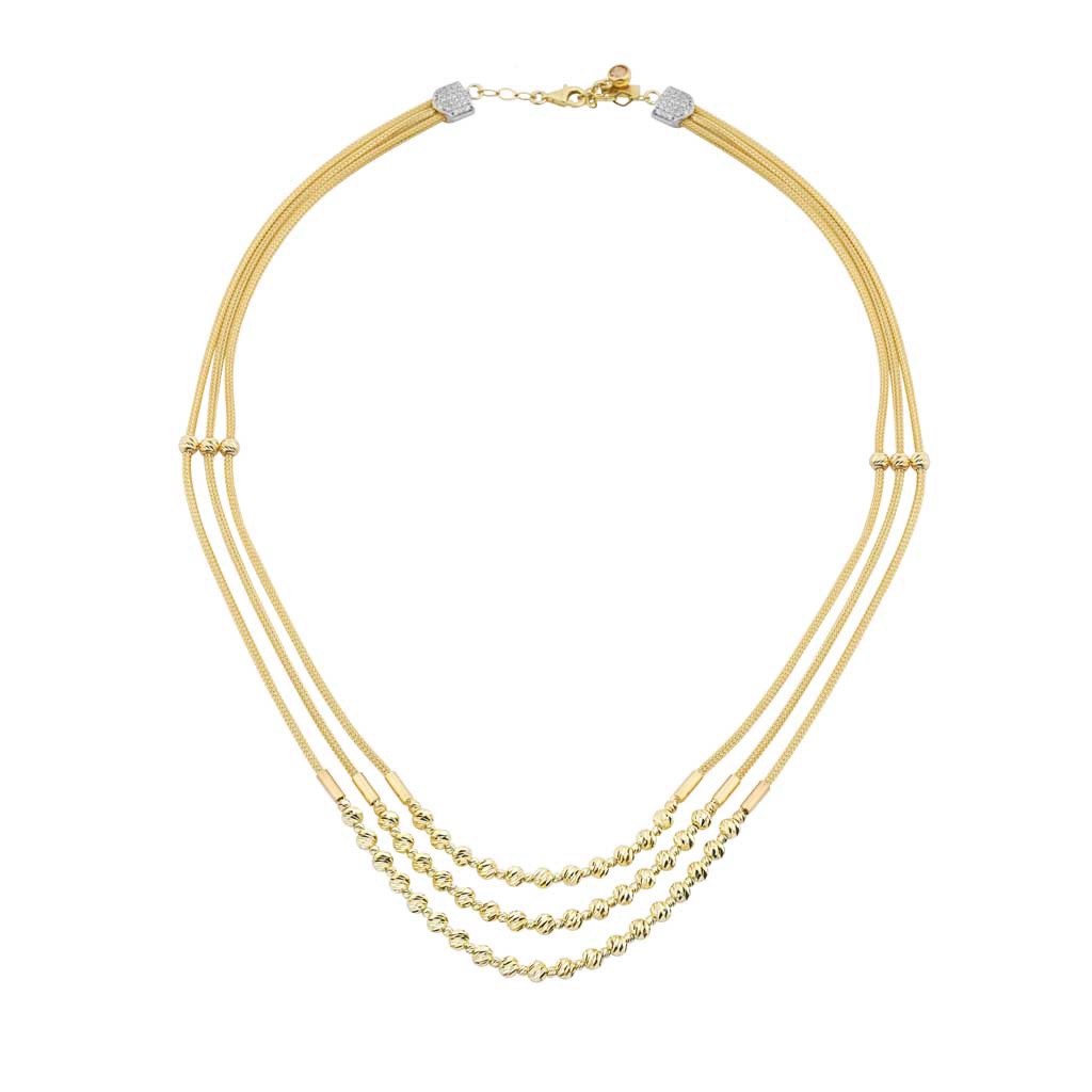 Колье из золота 585 пробы с тройными нитями и алмазной огранкой. Элегантное украшение для особых случаев и повседневной носки. Фантазийная модель состоит из шнурка с золотыми шариками, создающими эффект мерцания.