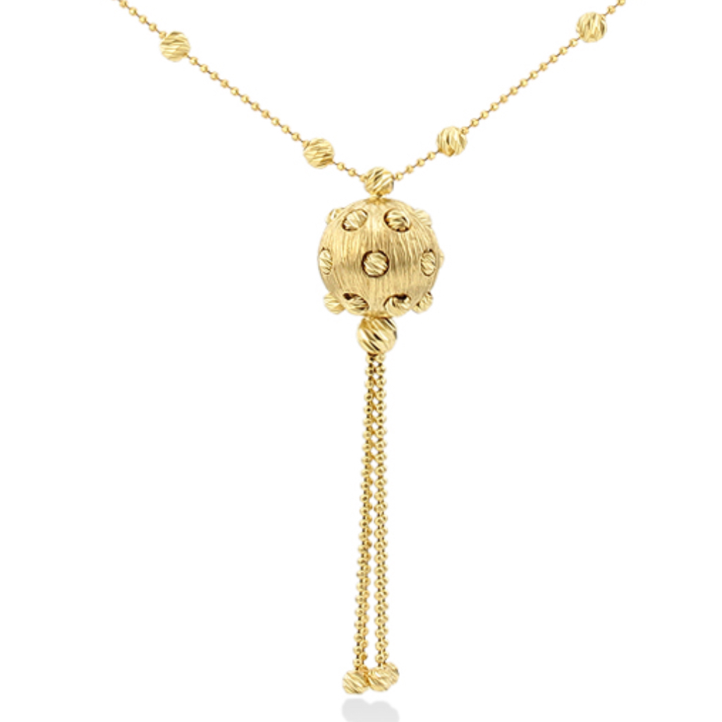 Колье из желтого золота 585 пробы - отличное украшение для себя и в подарок. Изящное фантазийное плетение очень красиво смотрится шее и подходит для любого случая. Колье состоит из цепочки из шариков, на которые надеты более крупные шарики и подвеска шар. Алмазная огранка придает украшению яркий переливающийся блеск. Подвеска шар дополнена кисточкой и имеет матово-сатиновую поверхность, что создает необычный контраст между ней и блестящими вкраплениями.