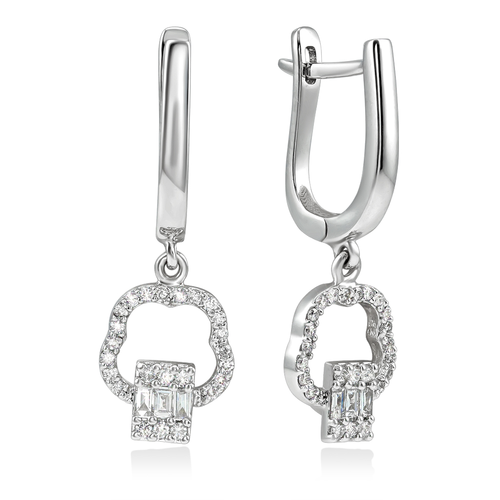 На гладком основании с английским замком закреплен подвижный декоративный элемент. Фигурная форма подвески украшена тремя бриллиантами багетной огранки и маленькими круглыми бриллиантами, создающими объемное мерцание. По окружности композицию дополняют мелкие бриллианты круглой огранки, усиливающие блеск и придающие украшению дополнительную выразительность.