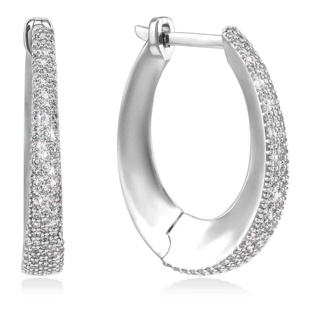 Серьги овальной формы, выполнены с утолщением по нижней части. по лицевой стороне их украшают 248 бриллиантов круглой огранки, которые нежно блестят и переливаются. Высота серьги 24 мм, ширина 20 мм, толщина от зауженной части к утолщению меняется от 3 до 5 мм. Длина штифта 10 мм.