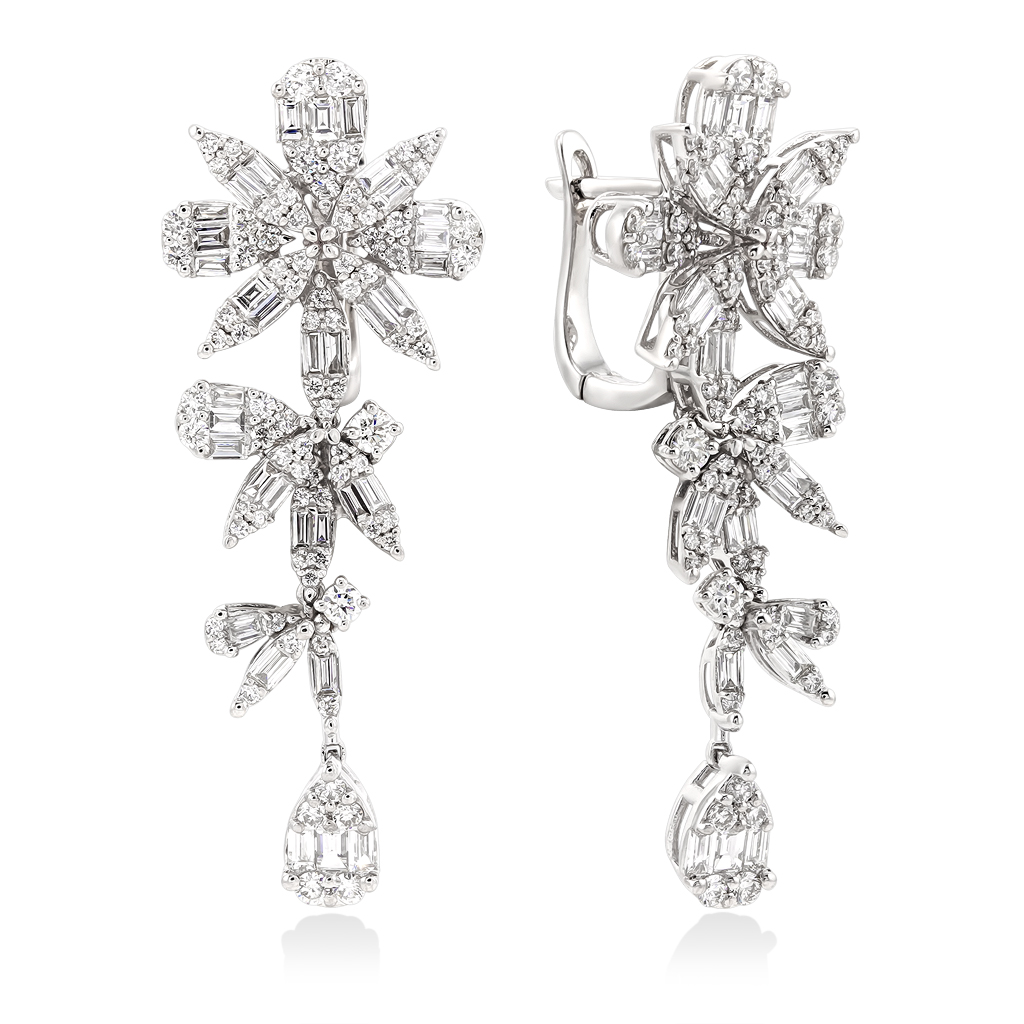 Великолепные нарядные серьги из белого золота с бриллиантами украсят Ваш праздничный образ и привлекут внимание окружающих. Серьги на английском замке с фигурным подвесным элементом щедро украшены бриллиантами разного размера круглой и фантазийной огранок. Такое сочетание камней придает серьгам свою неповторимую форму и особенный блеск.