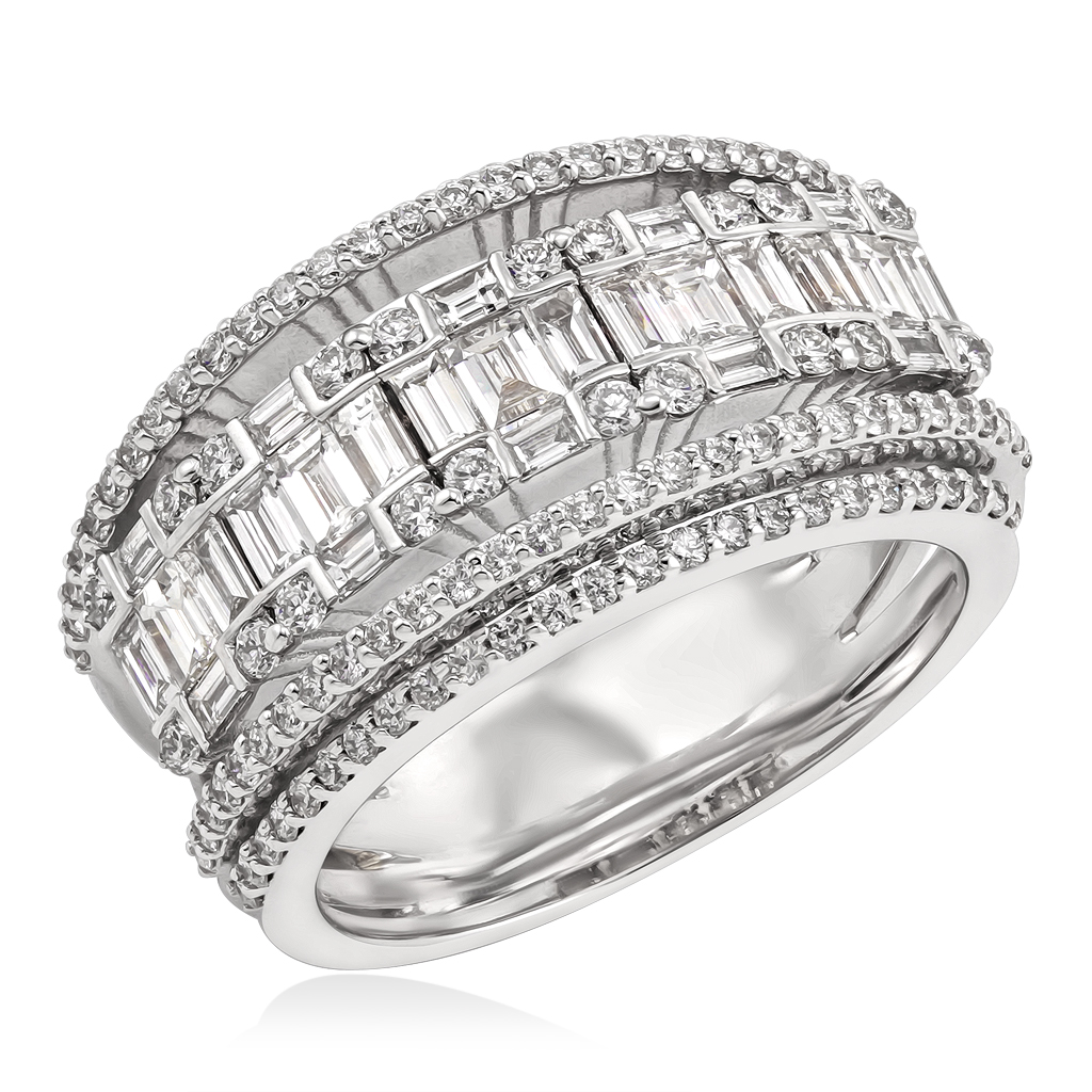 Кольцо с широким фантазийным декоративным элементом щедро украшено бриллиантами разного размера круглой и багетной огранок.