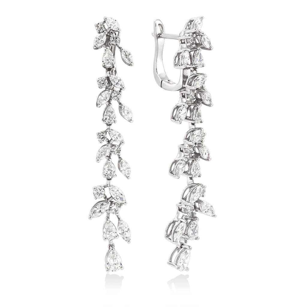 Великолепные нарядные серьги из белого золота с бриллиантами украсят Ваш праздничный образ и привлекут внимание окружающих. Серьги на английском замке с фигурным подвесным элементом щедро украшены бриллиантами разного размера круглой и фантазийной огранок. Такое сочетание камней придает серьгам свою неповторимую форму и особенный блеск. Английский замок как нельзя лучше подходит для такой модели, он надежно держит серьги и обеспечивает комфортную посадку.