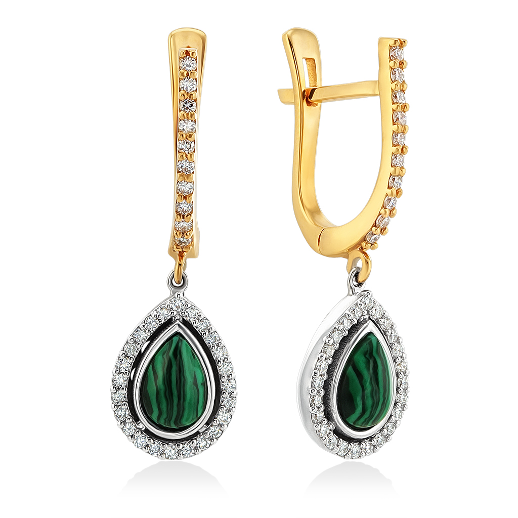 Золотые серьги из розового золота и бриллиантами и малахитом -это ответ современных дизайнеров винтажным украшениям и восточным традициям, где малахит считался признаком статуса. Серьги с английским замком и подвесным элементом в форме капли и украшены бриллиантами круглой огранки и малахитом благородного зеленого цвета.