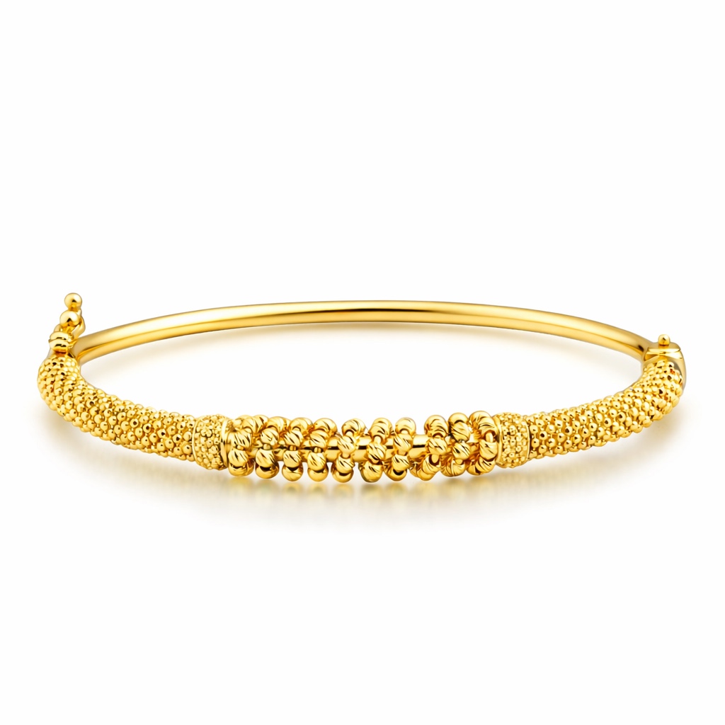 Жесткий браслет в виде обруча украшен по центральной части декоративными золотыми шариками с алмазной огранкой.