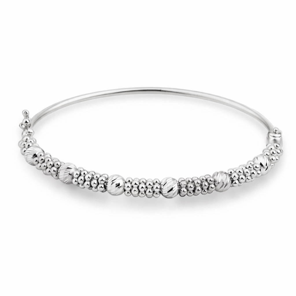Необычная фантазийная модель очень красиво смотрится на руке и подходит для любого случая. Жесткий браслет украшен шариками разного размера, что привлекает внимание и выглядит очень нарядно.