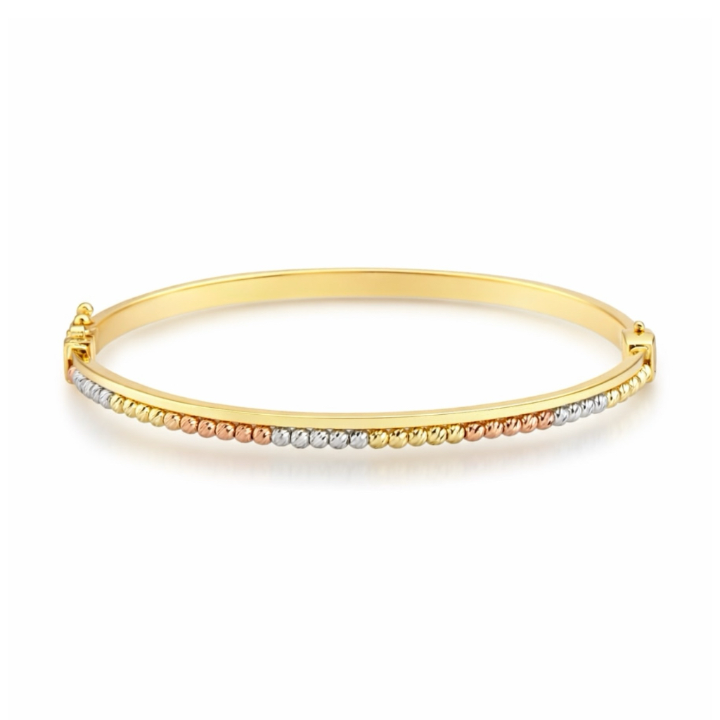 Он полый внутри, поэтому имеет небольшой вес. По окружности браслет украшен декоративными золотыми шариками с алмазной огранкой.